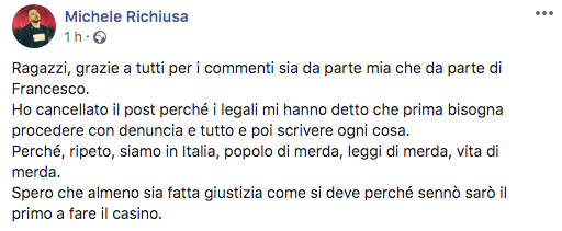 Tuttavia, poco dopo aver scritto il post di denuncia, Michele Richiusa lo ha eliminato.