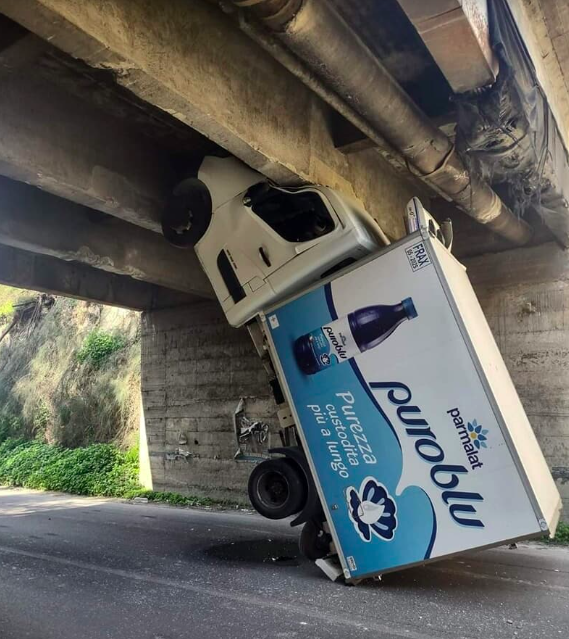L’incredibile incidente stradale è avvenuto sulla strada comunale per Vittoria, in provincia di Ragusa, allo svincolo per Acate. Fortunatamente non si registrano feriti anche perché all’interno del mezzo non c’era il conducente: il camion infatti si trovava sopra un carro attrezzi che lo stava portando in un’officina. E, forse senza pensare alle dimensioni dell’autoarticolato che stava trasportando, il conducente del carro attrezzi ha provato a passare sotto al ponte. Il furgone della Parmalat ha urtato il ponte e si è proiettato all’indietro, finendo per incastrarsi con la sua parte anteriore su una trave del sovrappasso restando sospeso verticalmente, tra l’incredulità dei passanti, che hanno immortalato la scena.