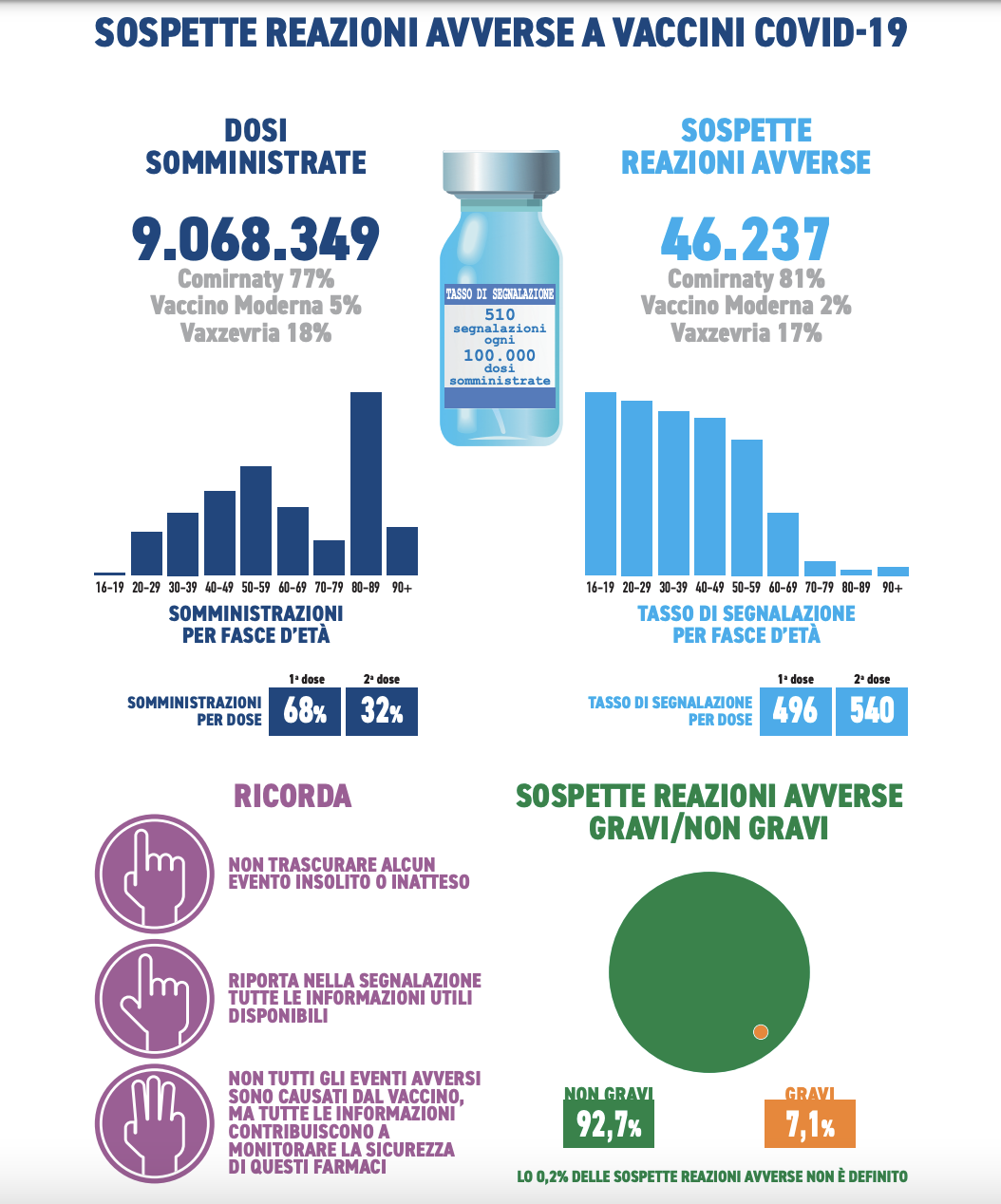 Nel rapporto, i cui dati si riferiscono al periodo compreso tra il 27 dicembre 2020 e il 26 marzo 2021, l’Aifa, l’Agenzia Italiana del Farmaco, afferma di aver ricevuto 46.237 segnalazioni di reazioni avverse su un totale di 9.068.349 dosi somministrate per tutti i vaccini, con un tasso di 510 ogni 100mila dosi.
