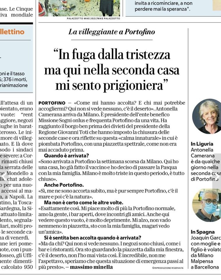 In un momento di profonda crisi economica e di nuovi lockdown, uno dei principali quotidiani italiani intervista una nobildonna che lamenta la desolazione dell'esclusiva cittadina ligure. La signora intervistata è la contessa Antonella Carnelli De Micheli Camerana, membro della dinastia azionista di Exor-Fca, che controlla il gruppo Gedi. Di cui Repubblica fa parte