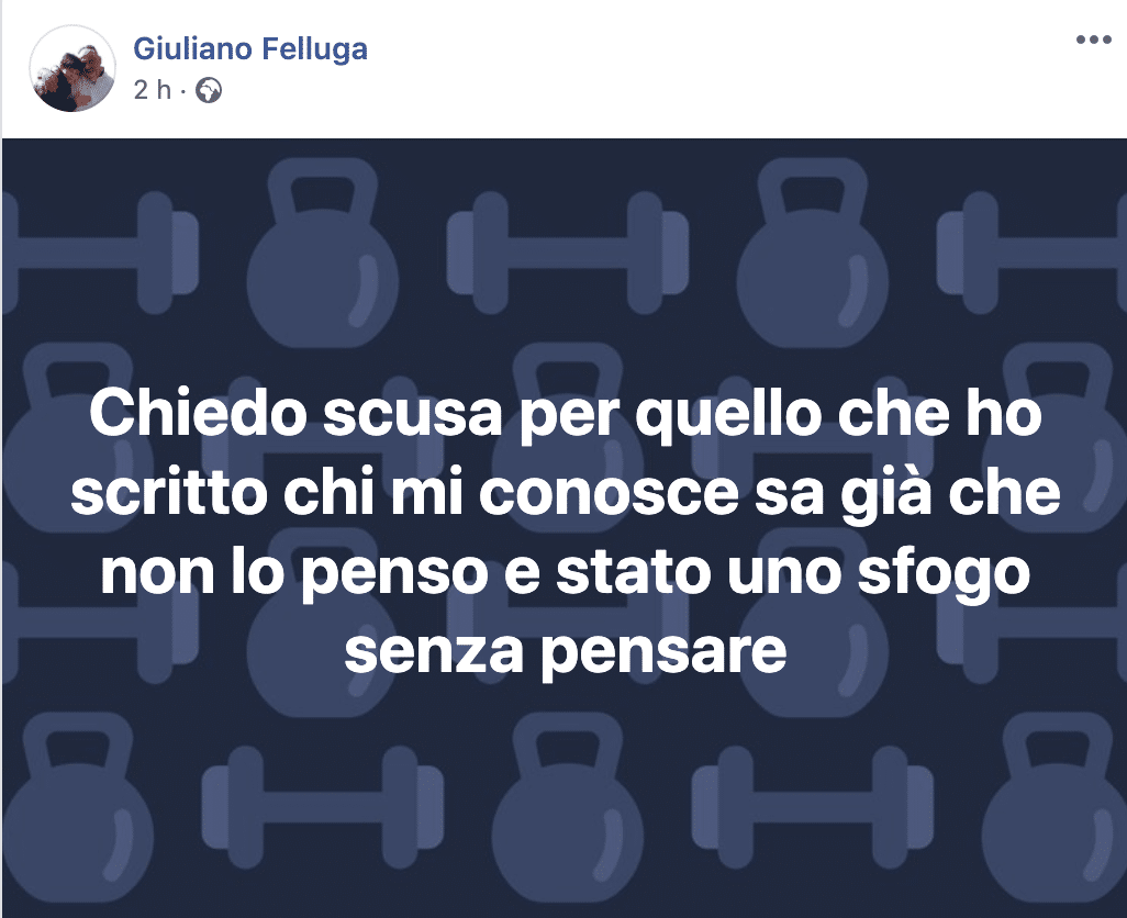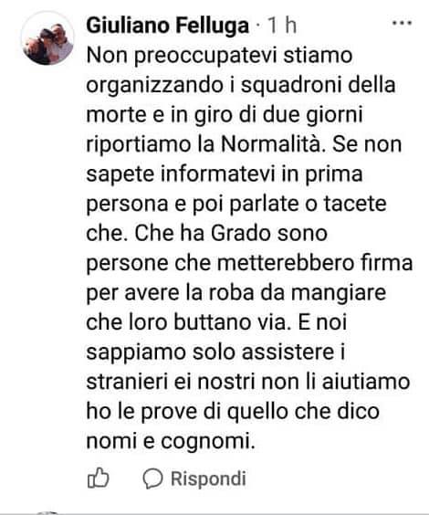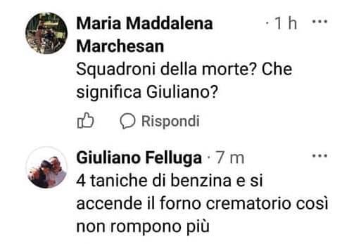 A un’utente che chiedeva spiegazioni sugli “squadroni della morte”, Felluga ha risposto: “Quattro taniche di benzina e si accende il forno crematorio, così non rompono più”. Le parole di Felluga hanno provocato la reazione della stessa Cecot, che ha definito le parole “gravissime, inaccettabili e vergognose” e anche della Cgil regionale, che ha chiesto al sindaco di Grado di prendere provvedimenti. Lo stesso Felluga, poco dopo, sul suo profilo Facebook ha pubblicato un post in cui si è scusato per quello che ha scritto aggiungendo: “Chi mi conosce sa già che non lo penso è stato uno sfogo senza pensare”.