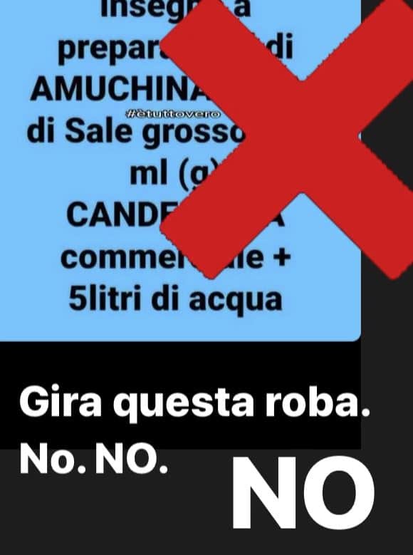 E pubblica l’immagine, diventata virale sui social, che diffonde informazioni errate su come fare l’amuchina in casa, allertando gli utenti a non seguirla né diffonderla. Quella scorretta prevede l’utilizzo di candeggina, sale grosso e acqua.