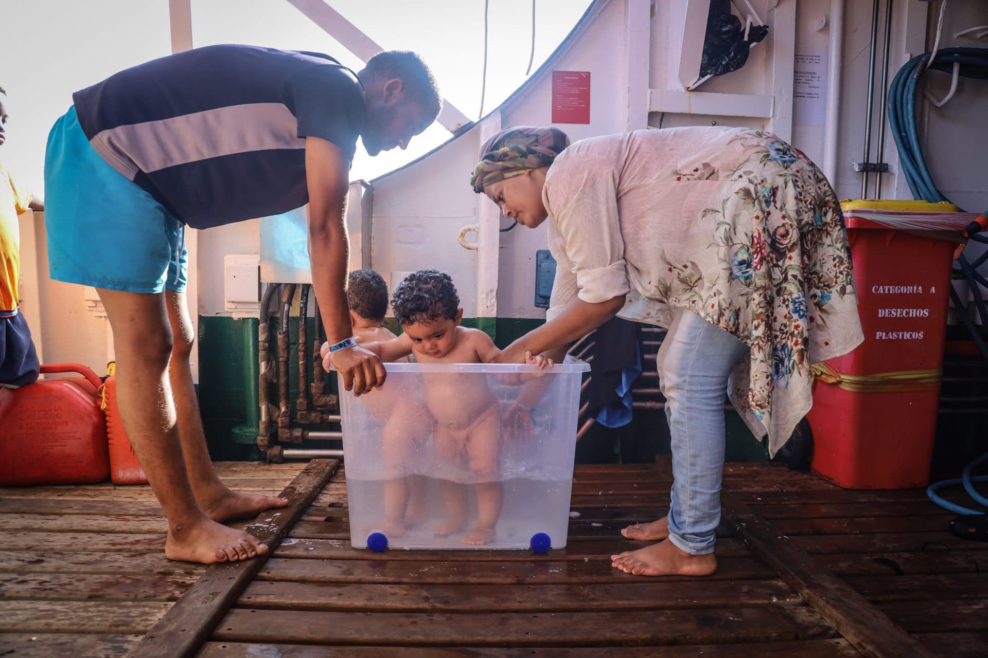 Prima di ripartire Richard e tutti gli altri fanno un giro per conoscere la nave e mentre il ponte di svuota i genitori di Moussa e Uma approfittano per fargli fare un bagnetto. Il ponte di poppa si ferma, tutti incantanti da questo momento di normalità e gioia nonostante al posto della vasca ci sia una grande scatola di plastica e che attorno a loro non ci sia un bagno ma un rimorchiatore di 35 metri, tutto ferro e motori ma con tanta umanità.