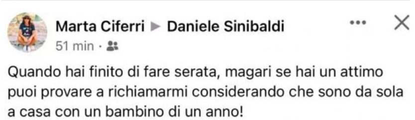 “Quando hai finito di fare serata, magari se hai un attimo puoi provare a richiamarmi considerando che sono da sola a casa con un bambino di un anno!”. È il messaggio lasciato sulla bacheca Facebook del sindaco di Rieti dalla moglie Marta Ciferri, è divenuto virale sul web.