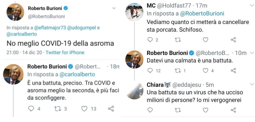 Una battuta infelice, certo. Che ha scatenato in pochi minuti una bufera sui social. Burioni ha aggiunto: “Preciso che è una battuta, datevi una calmata. Tra Covid e AS Roma preferisco la seconda, è più facile da sconfiggere”. Anche il conduttore e attore Luca Bizzarri si è unito alla discussione su Twitter: “Mi offro gratuitamente (come sempre) come social media manager“, ha scritto, rivolgendosi direttamente a Burioni. Immediata la risposta del virologo: “Lasciamo perdere, sono io ad essere fesso. Chi è cresciuto nel mondo reale fa fatica ad adattarsi a questo virtuale in età matura. Bisogna accettarlo. E se scrivevo “vecchio” poi mi crocifiggevano i coetanei”.