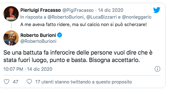 Le numerose reazioni negative generate dal tweet hanno spinto Roberto Burioni a cancellare il post poco dopo e a tornare sui suoi passi. “Se una battuta fa inferocire delle persone vuol dire che è stata fuori luogo, punto e basta. Bisogna accettarlo”, ha scritto più tardi per scusarsi.