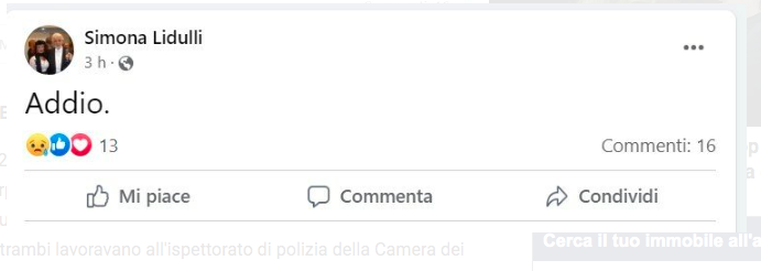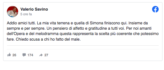 Anche la donna quasi in contemporanea ha pubblicato sui social un analogo ma conciso messaggio il che lascerebbe appunto supporre che la scelta condivisa sia la pista prioritaria anche se bisognerà attendere l’esito dei rilievi per capire se, ad esempio, pur avendo deciso entrambi di togliersi la vita, il marito possa averla uccisa per poi suicidarsi. Di certo molti amici e conoscenti, leggendo quei post, hanno supplicato invano la coppia consapevoli probabilmente delle problematiche vissute e forse riconducibili a qualche grave patologia.