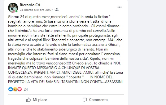 Partiamo dall’inizio. Il 2 aprile scorso il sindacato Usb ha denunciato la volontà del gruppo siderurgico ArcelorMittal (ex Ilva di Taranto, ndr) di licenziare due dipendenti avevano condiviso un post su Facebook (peraltro copiato e incollato da altri, quindi si tratta di messaggio comunque non loro) intorno al 24 marzo che invitava a seguire la fiction “Svegliati amore mio” con protagonista Sabrina Ferilli, legandola al dramma dell’inquinamento a Taranto.