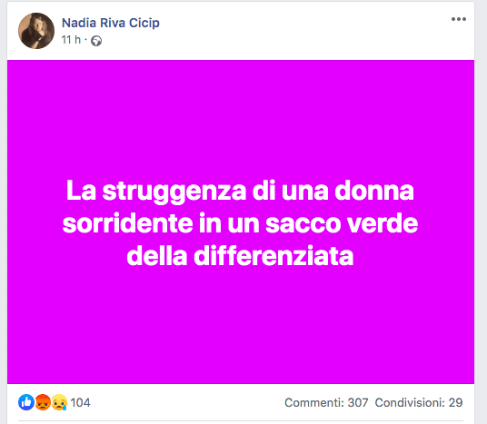 Riva ha pubblica su Facebook un post che ha scatenato un vero e proprio scontro tra femministe: “La struggenza di una donna sorridente in un sacco verde della differenziata”.