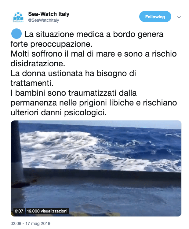 A causa della situazione creatasi a bordo, la Sea Watch ha chiesto di poter entrare in acque italiane per motivi umanitari, ma l’appello è stato respinto dal ministro dell’Interno Matteo Salvini.