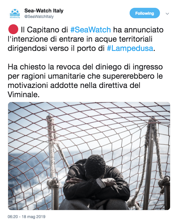 “Abbiamo fatto sbarcare malati e bambini, ma resta il divieto assoluto alla Sea Watch3 di entrare nelle nostre acque territoriali. Non cambiamo idea: porti chiusi per chi non rispetta le leggi, mette in pericolo delle vite, minaccia. Una Ong, peraltro straniera, non può decidere chi entra in Italia”, aveva affermato Salvini.