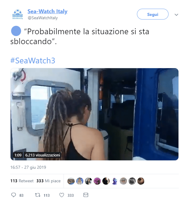 Finora la Sea Watch ha provato ad entrare nel porto di Lampedusa ma è stata bloccata dalle autorità italiane. “Questa mattina – informa la portavoce della ong, Giorgia Linardi – la nave ha comunicato con le autorità informandole che erano trascorse ormai 24 ore dalla dichiarazione dello stato di necessità che la ha costretta all’ingresso nelle acque territoriali. Alle 14.16, non avendo ricevuto nessuna comunicazione o assistenza, ha proceduto verso il porto. Ma a circa un miglio le è stato intimato di spegnere i motori.