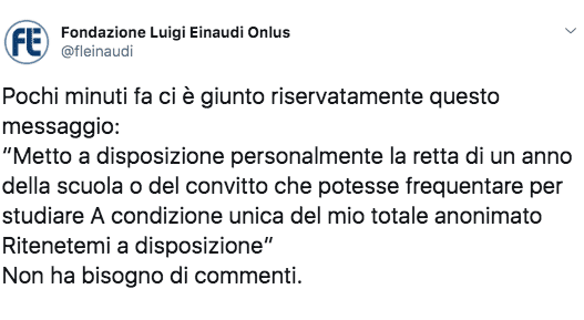 “Metto a disposizione personalmente la retta di un anno della scuola o del convitto che potesse frequentare per studiare, a condizione unica del mio totale anonimato. Ritenetemi a disposizione”, si legge nel tweet che riporta il messaggio dell’anonimo benefattore.