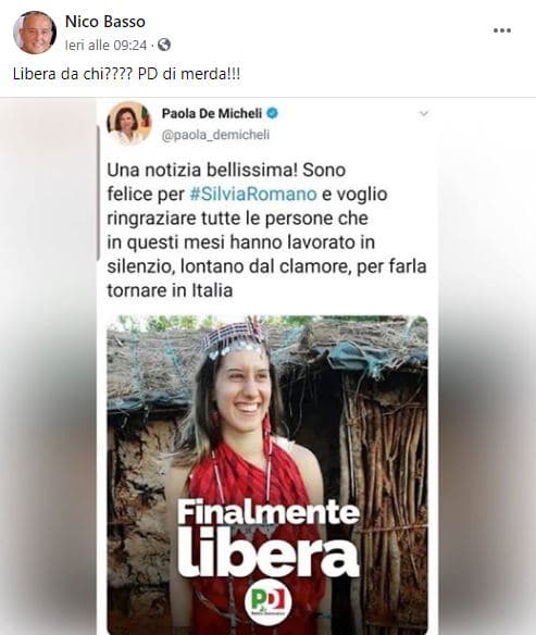 Il post, riferisce la stampa locale, è stato duramente condannato anche dal sindaco di Asolo, Mauro Migliorini, che ora sta valutando le richieste di dimissioni di Basso arrivate da più parti. Ma non è tutto. Il consigliere, dopo la liberazione della cooperante, ha pubblicato insulti anche contro Giuseppe Conte e Luigi Di Maio, oltre che contro il Pd. Commentando il tweet di Paola De Micheli (molto criticato) sulla librazione di Silvia, Basso ha scritto: “Libera da chi? Pd di mer***”.