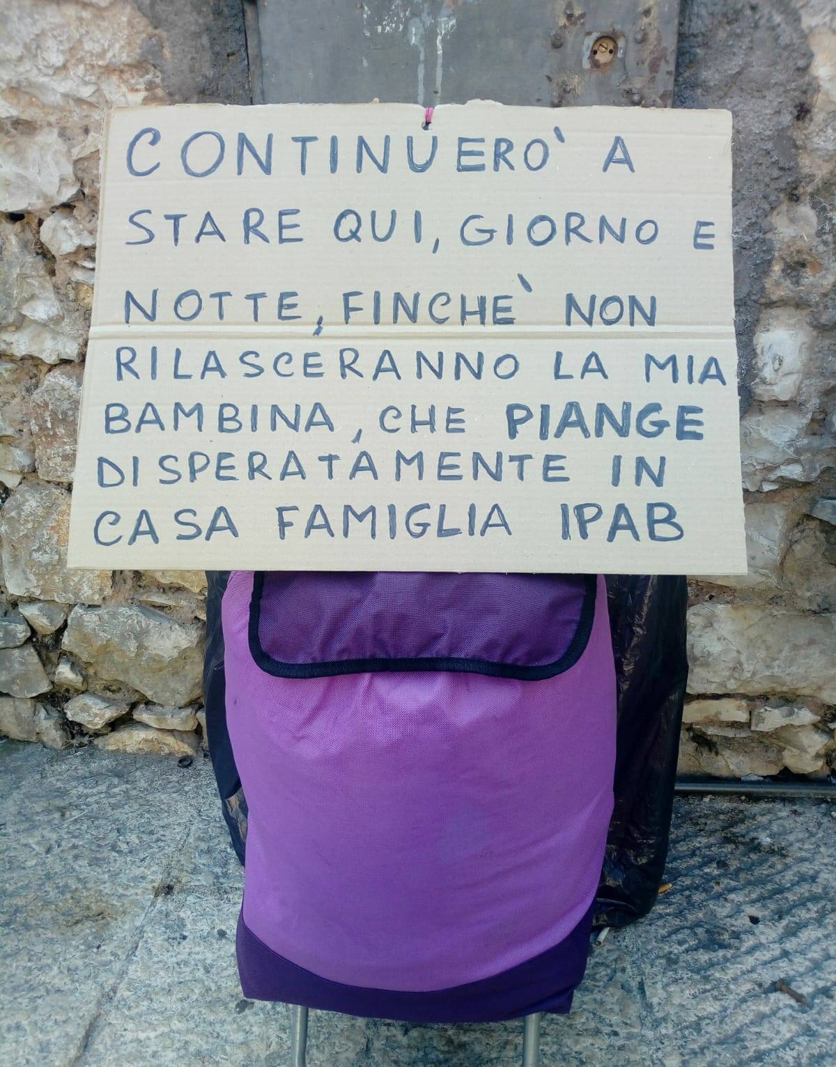 “Continuerò a stare qui, giorno e notte, finché non rilasceranno la mia bambina, che piange disperatamente in casa famiglia”, il cartello che Sabrina espone vicino alla panchina dove dorme da giorni mostra tutta la rabbia e tutta la fragilità di una mamma che un mese non può riabbracciare la figlia.
