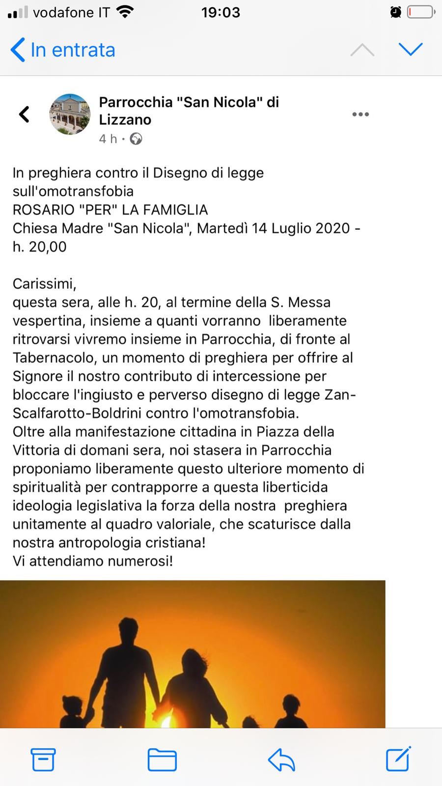 A Lizzano, in provincia di Taranto, la parrocchia San Nicola ha organizzato nella serata di ieri, martedì 14 luglio, una veglia di preghiera contro il disegno di legge sull’omotransfobia. A margine dell’iniziativa, voluta dal parroco don Giuseppe Zito, si è tenuta una manifestazione protesta di attivisti Lgbt. Il parroco ha chiesto l’intervento dei carabinieri, che hanno identificato i manifestanti.