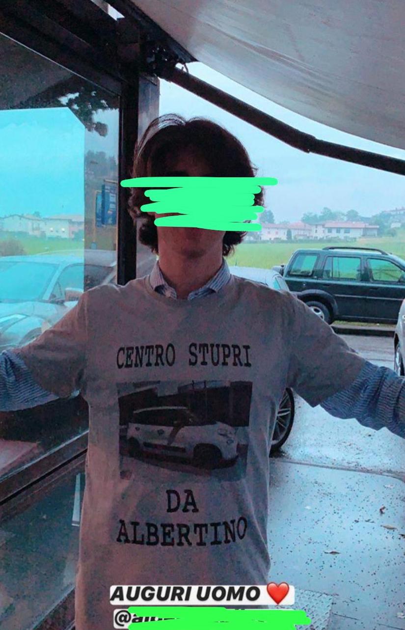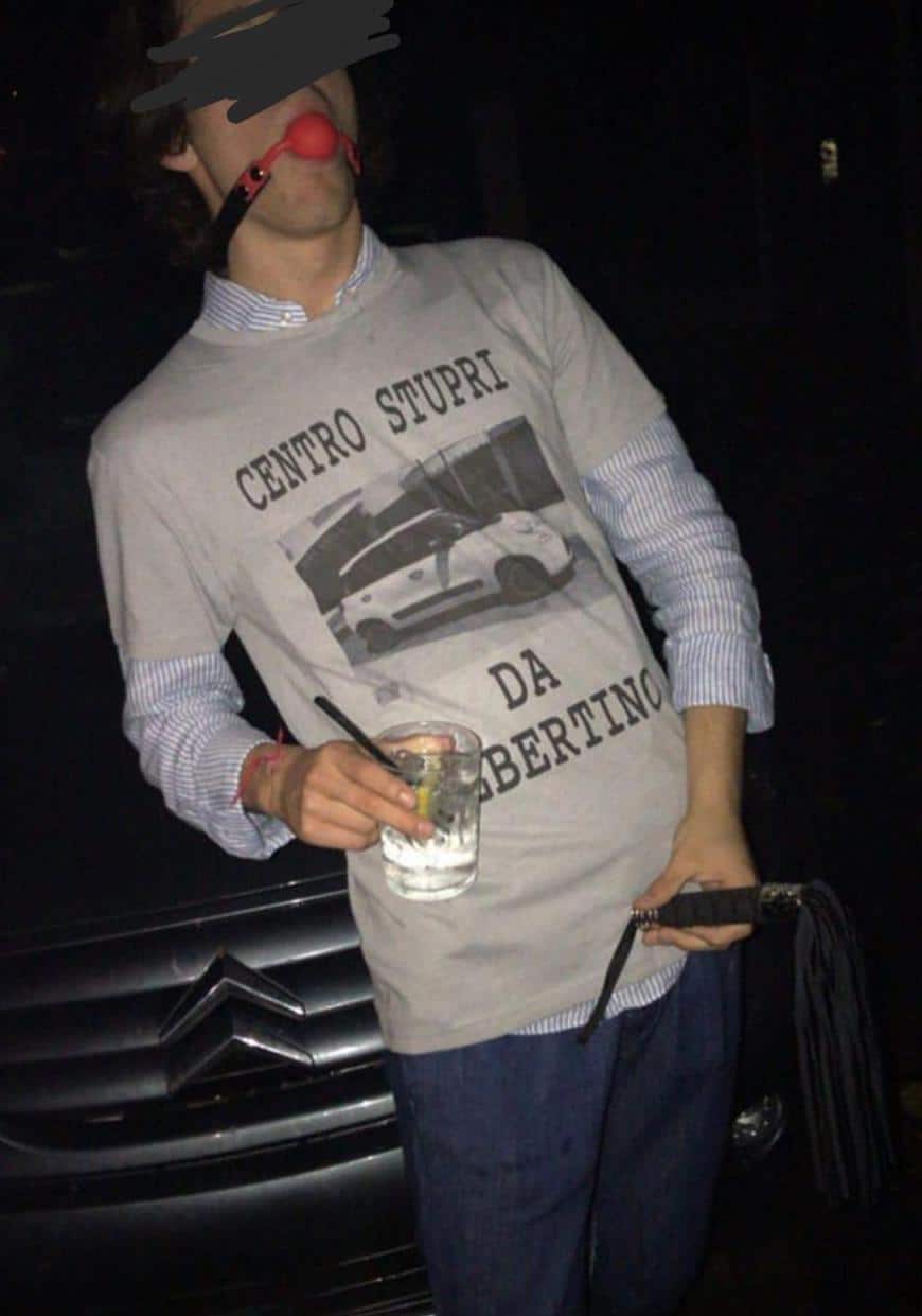 Qualche giorno prima alcuni di loro si erano presentati in un ristorante a San Daniele (di proprietà dei genitori di uno dei ragazzi) con delle t-shirt tutte uguali con la scritta “Centro stupri” e i loro nomi/soprannomi sul retro della maglietta. (uno con la scritta “L’occhio del negro”) Naturalmente immortalando la scena e pubblicando il tutto. Alcune foto sono finite sui loro social, in una di queste uno di loro posava con tanto di frusta e una ball bag (il bavaglio/palla del bondage) in bocca.