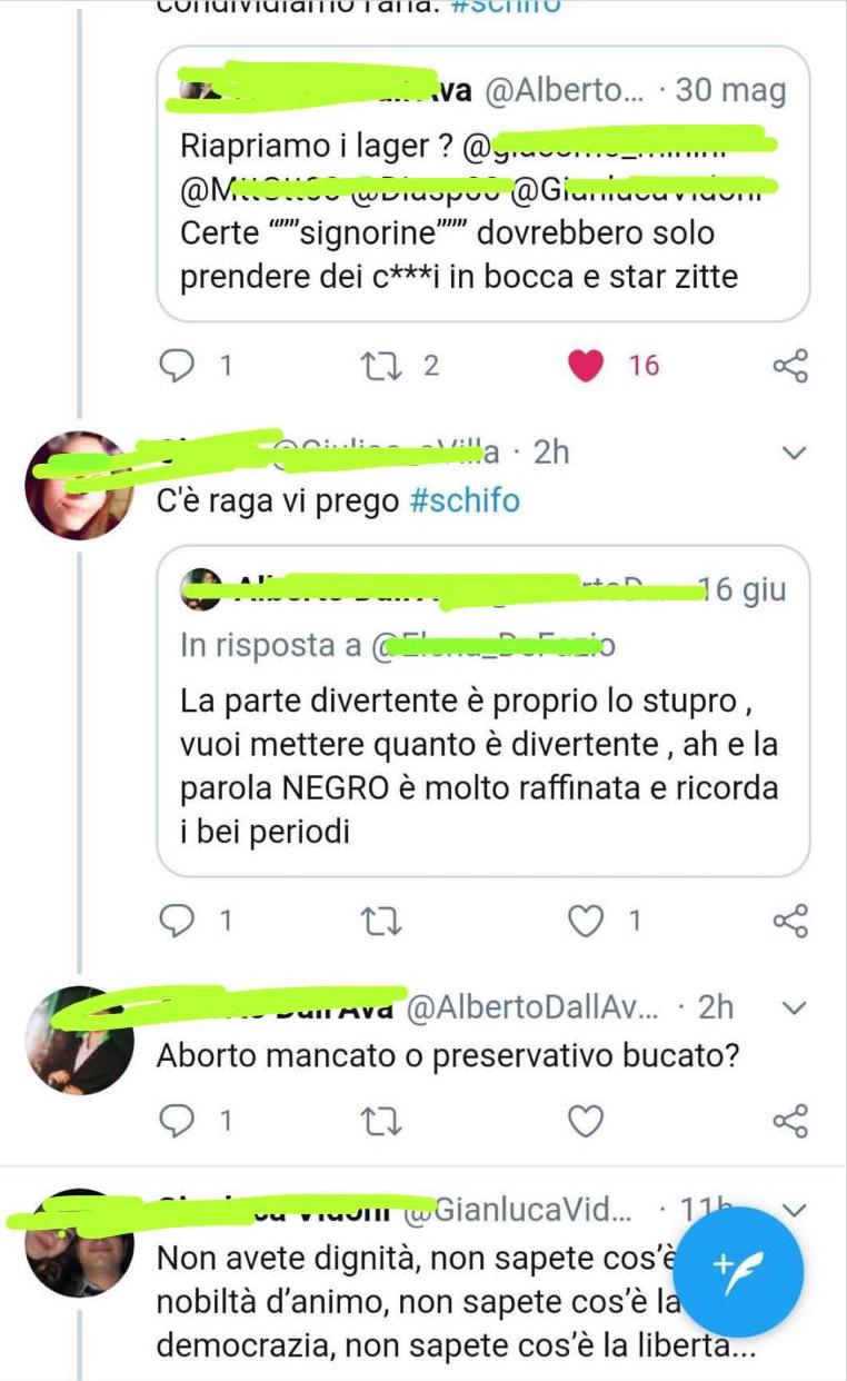 Un’immagine è stata postata anche su twitter, dove alcune ragazze hanno protestato per la scritta, per poi ricevere le seguenti risposte: “Certe signorine dovrebbero prendere solo i c…i in bocca e stare zitte”. Lo scrive Alberto, uno di loro, su twitter il 30 maggio. E anche “La parte divertente è proprio lo stupro, vuoi metter quanto è divertente, ah e la parola NEGRO è molto raffinata e ricorda i bei periodi”, “Siete dei poveri comunisti”. Un altro di loro, Gianluca, sempre rispondendo alle critiche, scrive: “Non sapete cos’è la nobiltà d’animo, non sapete cos’è la democrazia…”. Matteo: “Comunisti di merda”.