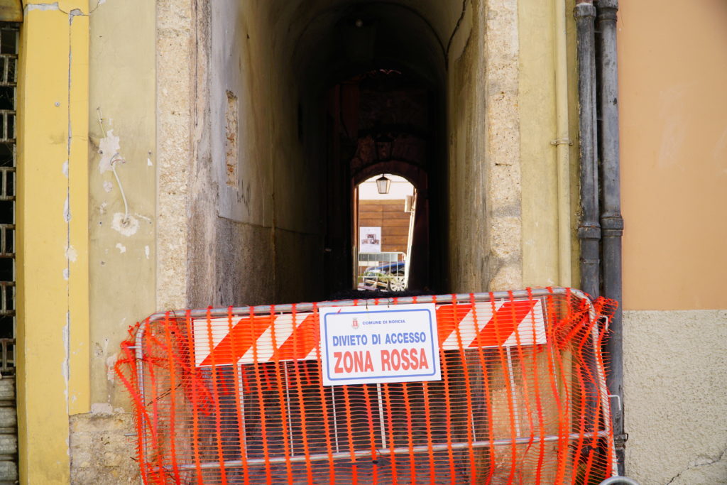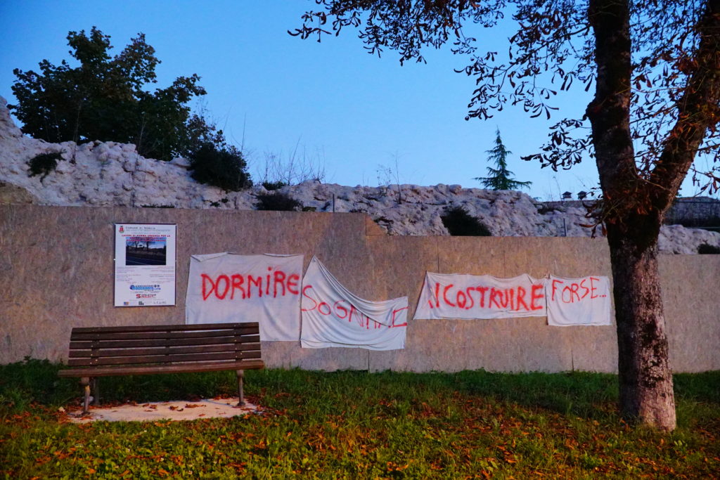 Al chioschetto subito fuori Porta Romana – che d’estate è il punto di ritrovo dei tanti che tornano al paese d’origine dopo aver trascorso il resto dell’anno fuori – uno sparuto gruppo di giovani e meno giovani gioca a carte davanti a una birra. È l’immagine di un paese sospeso, fermo, che attende paziente e stanco. Per la terza volta le macerie grigie di Norcia si colorano dei colori caldi dell’autunno, in un contrasto che fa male agli occhi e all’anima. Rassegnazione è la parola d’ordine in una Norcia abbandonata, vittima del terremoto prima e del sistema poi. “Dormire, sognare, ricostruire… forse”, si legge su uno striscione affisso fuori dalle mura della città, sulla strada che affaccia sulla vallata bruna che accoglie chi arriva a Norcia. Quel “forse” per i nursini, a tre anni dal terremoto che ha cambiato le loro vite e le loro anime, pesa più delle macerie.