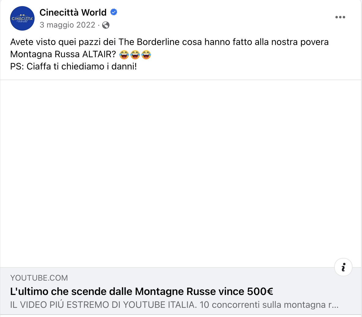 Una volta realizzata la challenge e montato il video, il filmato è stato poi ricondiviso sui social di Cinecittà World in cui gli youtuber venivano presentati ancora una volta come dei “pazzi”.