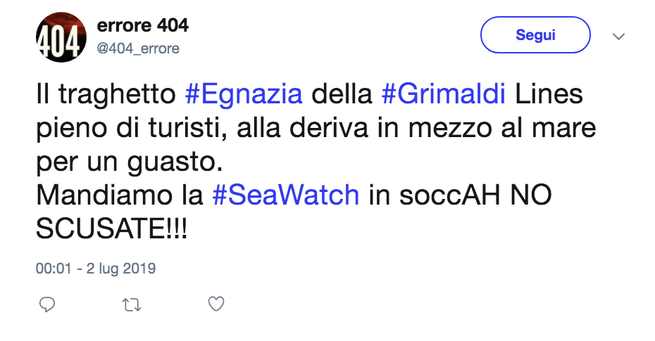 “Il traghetto #Egnazia della #Grimaldi Lines pieno di turisti, alla deriva in mezzo al mare per un guasto. Mandiamo la Sea Watch in soccAH NO SCUSATE!”, commenta un altro.