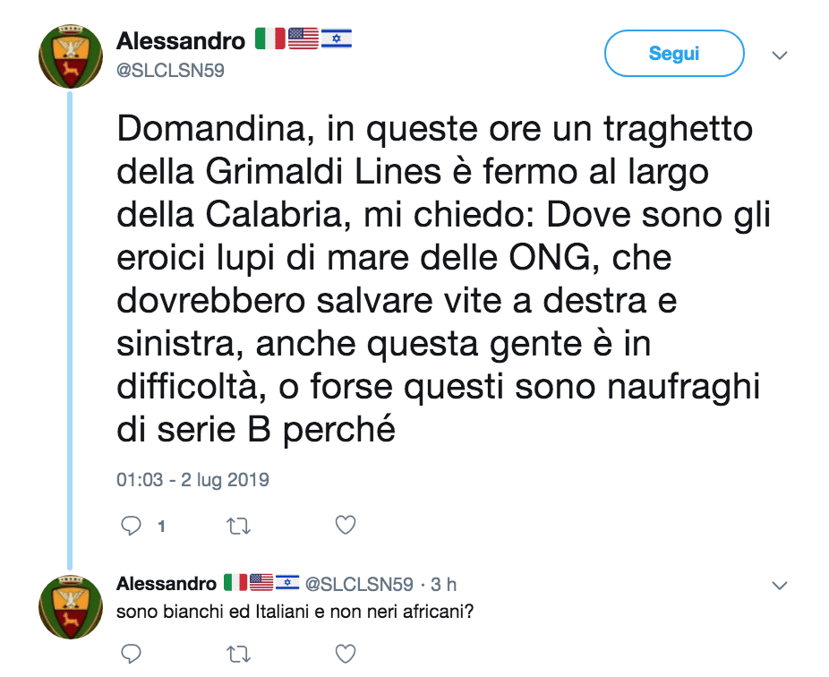 Sui social però gli utenti hanno commentato la vicenda del traghetto in mezzo al mare con frasi tendenziose. “Domandina, in queste ore un traghetto della Grimaldi Lines è fermo al largo della Calabria, mi chiedo: Dove sono gli eroici lupi di mare delle Ong, che dovrebbero salvare vite a destra e sinistra, anche questa gente è in difficoltà, o forse questi sono naufragi di serie B perché”, scrive un uomo su Twitter.