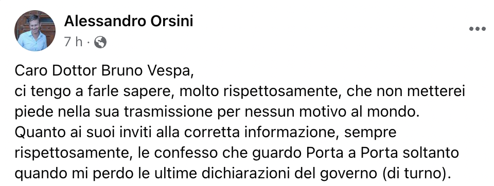 “Caro Dottor Bruno Vespa, ci tengo a farle sapere, molto rispettosamente, che non metterei piede nella sua trasmissione per nessun motivo al mondo. Quanto ai suoi inviti alla corretta informazione, sempre rispettosamente, le confesso che guardo Porta a Porta soltanto quando mi perdo le ultime dichiarazioni del governo (di turno)”.