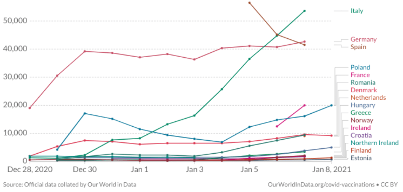 Secondo i dati elaborati dal sito di statistiche Our World in Data, che attinge alle informazioni fornite dai singoli governi, l’Italia è prima nell’Unione europea per la somministrazione quotidiana delle dosi di vaccini. Nel grafico viene mostrata la media settimanale dal 28 dicembre con il conteggio per singola dose, che non corrisponde quindi al totale delle persone vaccinate perché possono essere necessarie più dosi.