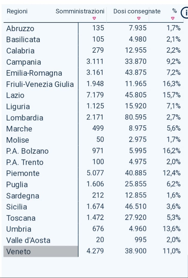 Tra le migliori regioni al momento ci sono Friuli Venezia Giulia con il 16,3 per cento di dosi somministrate, la provincia autonoma di Bolzano con il 16,2 per cento e il Lazio con il 15,7. Appena fuori dal podio l’Umbria con 13,6 per cento. Chi invece non se la sta cavando benissimo, stando ai numeri ufficiali comunicati ad oggi – 1 gennaio 2021 -, sono Sardegna 1,6 per cento, Abruzzo 1,7 per cento, Molise 1,7 per cento, Valle d’Aosta 2 per cento e le varie Basilicata, Calabria, provincia autonoma di Trento e Lombardia (la regione che ha avuto più dosi: 80.595) che non raggiungo il 3 per cento.