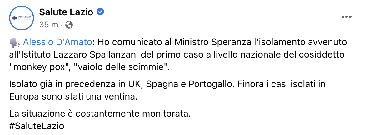 Anche l’assessore alla Salute della regione Lazio, Alessio D’Amato, ha fatto sapere attraverso i social di aver “comunicato al ministro Speranza l’isolamento avvenuto all’Istituto Lazzaro Spallanzani del primo caso a livello nazionale del cosiddetto ‘monkey pox’, ‘vaiolo delle scimmie’. Isolato già in precedenza in UK, Spagna e Portogallo. Finora i casi isolati in Europa sono stati una ventina. La situazione è costantemente monitorata”.