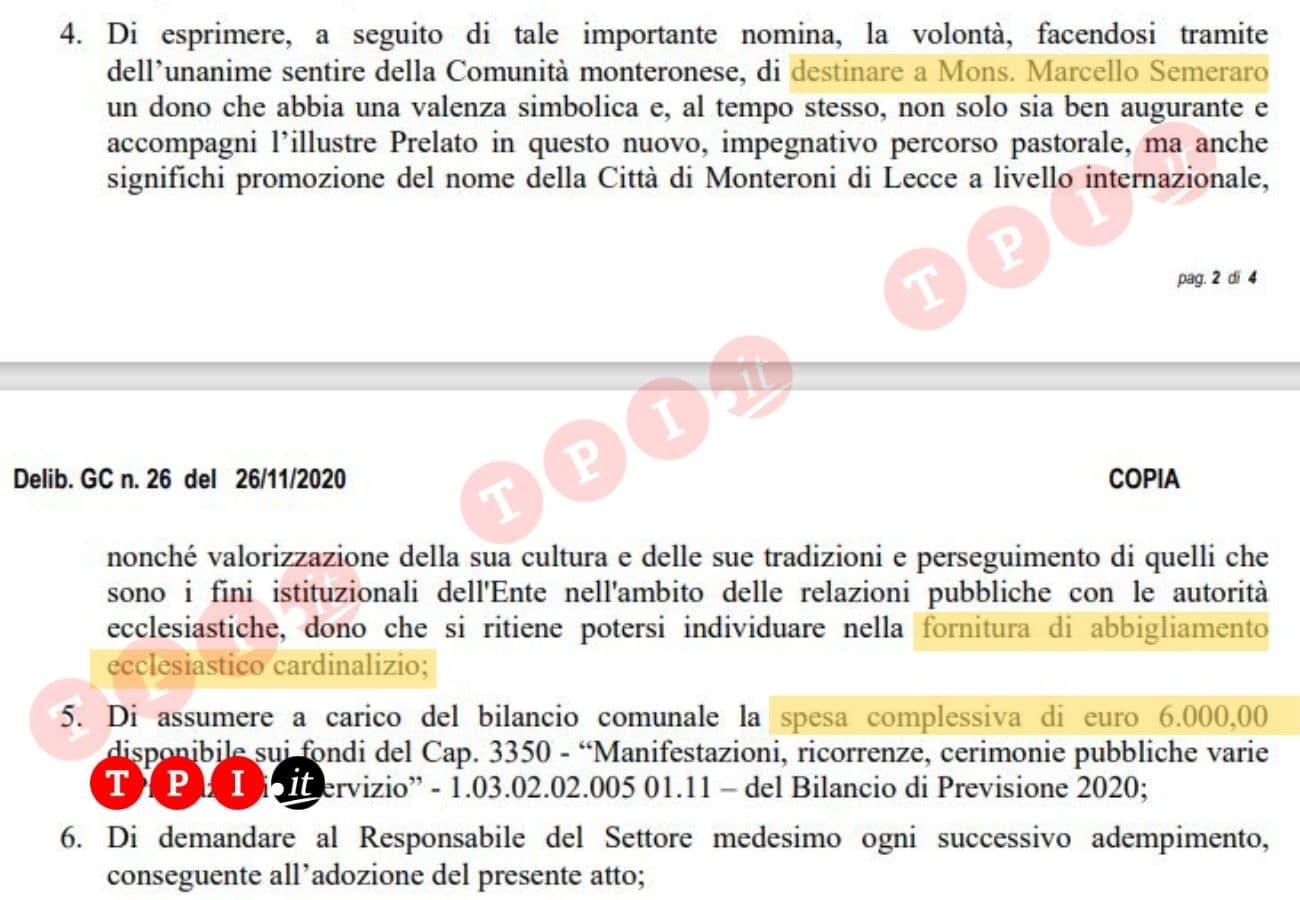 Il caso è stato sollevato dalla lista Monteroni a Sinistra, che ha inviato una lettera aperta al cardinale perché devolva l’importo in beneficenza. Con l’aiuto del giornalista salentino Danilo Lupo, abbiamo recuperato la delibera, datata 26 novembre 2020, con cui la Giunta comunale di Monteroni di Lecce ha deciso di “manifestare gioia, affetto e orgoglio” per la nomina in Vaticano del proprio concittadino destinandogli una fornitura di abbigliamento ecclesiastico cardinalizio.