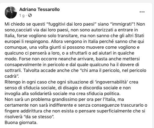Fa discutere l’ultimo post pubblicato su Facebook dal vescovo della diocesi di Chioggia. Commentando la questione immigrazione in Italia Mons. Adriano Tessarollo utilizza parole durissime. “Mi chiedo se questi ‘fuggitivi dai loro paesi’ siano ‘immigrati’! Non sono, cacciati via dai loro paesi, non sono autorizzati a entrare in Italia, forse vogliono solo transitare, ma non sanno che gli altri Stati europei li respingono. – scrive sui social il vescovo – Allora vengono in Italia perché sanno che qui comunque, una volta giunti si possono muovere come vogliono e qualcuno ci penserà a loro, o a sfruttarli o ad aiutarli in qualche modo”.