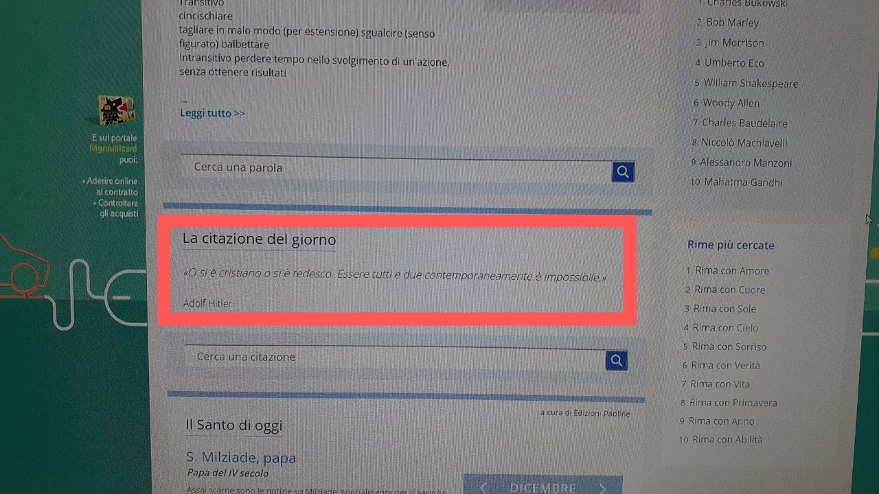 Oggi, martedì 10 dicembre, la citazione del personaggio di turno, portava la firma di Adolf Hitler: “O si è cristiano o si è tedesco. Essere tutti e due contemporaneamente è impossibile”. Successivamente la frase è stata rimossa.