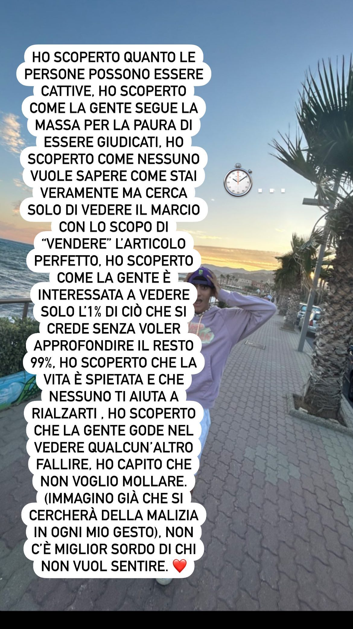 In una stories postata sul suo profilo Instagram, infatti, Loiacono ha scritto: “Ho scoperto quanto le persone possano essere cattive. Ho scoperto come la gente segue la massa per la paura di essere giudicata. Ho scoperto come nessuno vuole sapere come stai veramente ma cerca solo di vedere il marcio con lo scopo di vendere l’articolo perfetto. Ho scoperto come la gente interessata a vedere solo l’1% di ciò che si crede senza voler approfondire il resto 99%”.