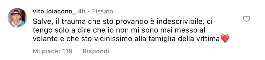 Nell’ultimo video postato sul suo profilo Instagram, infatti, lo youtuber, che collabora con i The Borderline, ha scritto come primo commento: “Salve, il trauma che sto provando è indescrivibile, ci tengo solo a dire che io non mi sono mai messo al volante e che sto vicinissimo alla famiglia della vittima”.