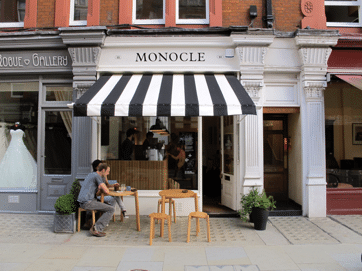Posizionato su Chiltern Street, Marylebone, la facciata a strisce bianche e nere di Monocle è una delle vetrine più belle di Londra, clientela prettamente benestante popola i pochi tavoli fuori durante la bella stagione e le belle giornate.