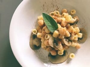 Una crema di ceci tutta da masticare e che non si mangia per forza col cucchiaio perché insieme a lei ci sono anche i funghi champignon e la pasta a tubetti.