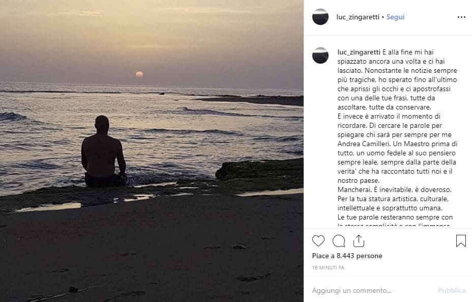 Luca Zingaretti continua: “Un Maestro prima di tutto, un uomo fedele al suo pensiero sempre leale, sempre dalla parte della verità che ha raccontato tutti noi e il nostro paese. Mancherai. È inevitabile, è doveroso. Per la tua statura artistica, culturale, intellettuale e soprattutto umana. Le tue parole resteranno sempre con la stessa semplicità e con l’immensa generosità e saggezza con cui le hai condivise, da mente libera e superba quale sei. Ma soprattutto mancherai a me perché in tutti questi anni meravigliosi in cui ho incrociato la mia vita con quella del commissario, mi sei stato amico. Ho avuto la strana sensazione che bastasse un tuo tratto di penna a cambiare la mia vita”.
