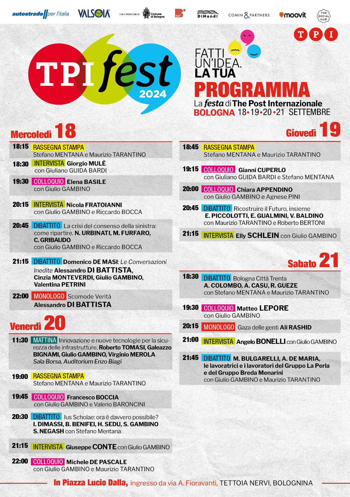 Sul palco allestito presso la Tettoia Nervi in piazza Lucio Dalla, a Bologna, da mercoledì 18 a sabato 21 settembre 2024, si alterneranno alcuni fra i più noti nomi della politica e del giornalismo italiano: da Giuseppe Conte a Elly Schlein, passando per Matteo Lepore, Alessandro Di Battista, Andrea Orlando, Gianni Cuperlo, Giorgio Mulè, Chiara Appendino e tanti altri ancora.