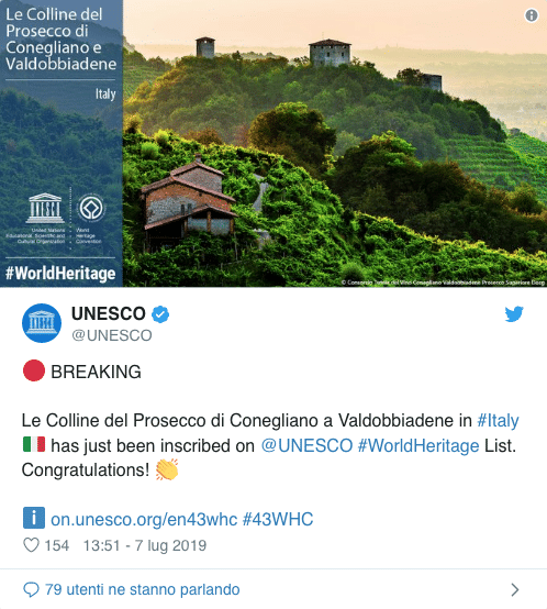 La nuova iscrizione riguarda i 97 chilometri quadrati composti da colline, vigneti e borghi della Sinistra Piave tra Conegliano e Valdobbiadene. Questi diventano l’ottavo sito veneto e il 55esimo sito italiano sotto l’egida Unesco.