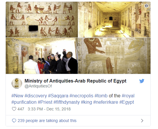 In Egitto, nella necropoli di Saqqara, a sud del Cairo, il 15 dicembre 2018 è stata scoperta la tomba di un sacerdote faraonico risalente al periodo della V dinastia risalente a oltre 4.400 anni fa.