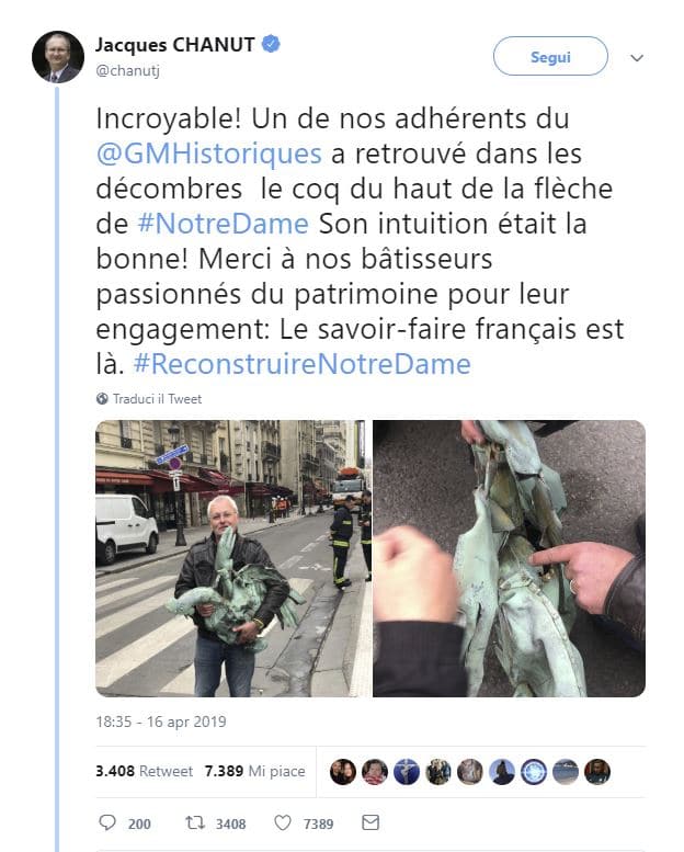 Il presidente della Federazione francese dei costruttori Jacques Chanut ha reso noto il ritrovamento pubblicando sul suo account Twitter lo scatto del gallo e alcuni dettagli dell’opera. Accanto alle foto, Chanut ha scritto: “Incredibile, uno dei nostri iscritti al GMH (Gruppo di imprese di restauro di monumenti storici) ha ritrovato tra le macerie il gallo della guglia di Notre Dame. Grazie ai nostri costruttori amanti del patrimonio per il loro coinvolgimento. In loro c’è il savoir-faire francese”.