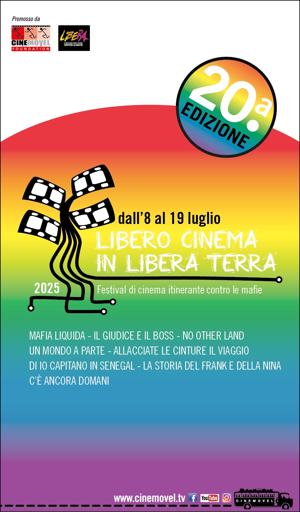 Torna Libero Cinema in Libera Terra. Dall’8 al 19 luglio 2025 andrà in scena la 20esima edizione del Festival di cinema itinerante contro mafie e corruzione. Per il ventesimo anno consecutivo il furgone di Libero Cinema in Libera Terra percorrerà le strade del Paese portando il suo messaggio nelle piazze, nei parchi, nelle periferie, nelle terre e nei beni confiscati ai mafiosi e restituiti alla collettività con l’obiettivo di promuovere, attraverso la cultura, l’allargamento degli spazi democratici, percorsi di cittadinanza attiva, la difesa dei diritti universali.
