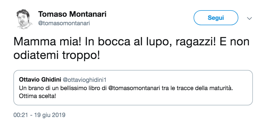 Il saggista italiano, appresa la notizia che un suo testo è stato scelto dal Miur per la prima prova dell’esame di maturità, ha commentato su Twitter: “Mammia mia! In bocca al lupo ragazzi! E non odiatemi troppo!”.