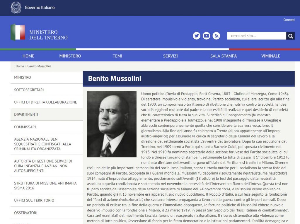Sul perché la biografia di Benito Mussolini compaia sul sito del Ministero dell’Interno la spiegazione c’è: sul portale compaiono le vite di tutti (o quasi) gli inquilini del Viminale. Benito Mussolini lo è stato tra il 1922 e il 1924 e tra il 1926 e il 25 luglio 1943.