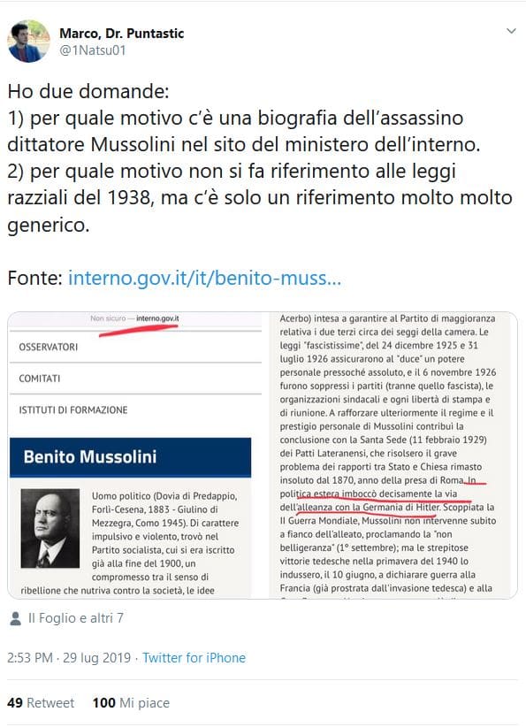 Qualcuno che con il Duce e con le sue idee non ha proprio niente a che spartire ha sollevato una questione interessante. Su Twitter l’account 1Natsu01 ha scritto un post in cui faceva notare che sul sito del Ministero dell’Interno esiste una biografia di Benito Mussolini, ma non solo. La cosa più inquietante è che nella lunga vita del dittatore viene omessa la pubblicazione delle leggi razziali.