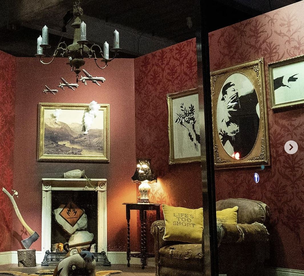 Nello show room moltissimi altri oggetti d’arredo, compresi i graffiti storici appesi alle pareti e la culla di un bambino circondata da telecamere di video sorveglianza. Tra questi spunta anche un riferimento all’identità nascosta dell’artista, che secondo alcuni sarebbe in realtà Robert Del Naja dei Massive Attack. In un camino dello shop, infatti, si scorge su un cuscino proprio il logo della band britannica.