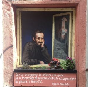 L’omaggio a Peppino nasce in vico della Rosa. L’autore resta anonimo, ma non serve un nome, quando il soggetto è il messaggio dell’attivista antimafia. Peppino sorride nel murale, affacciato a una finestra, guarda Genova e ricorda l’importanza di non piegarsi alla rassegnazione, alla paura, all’omertà.