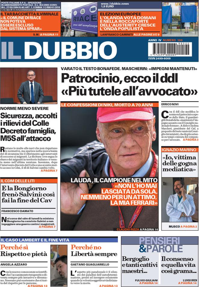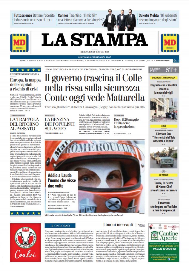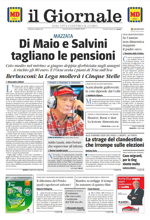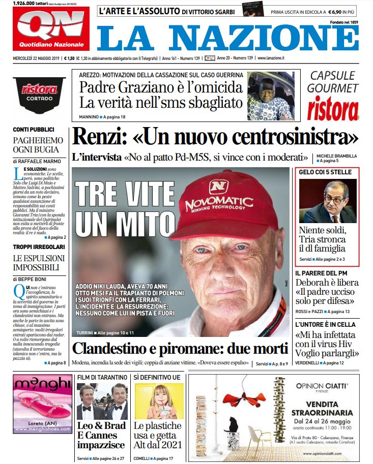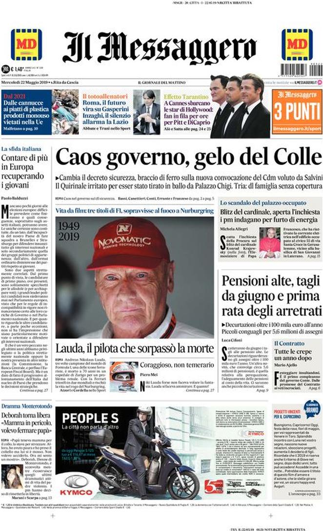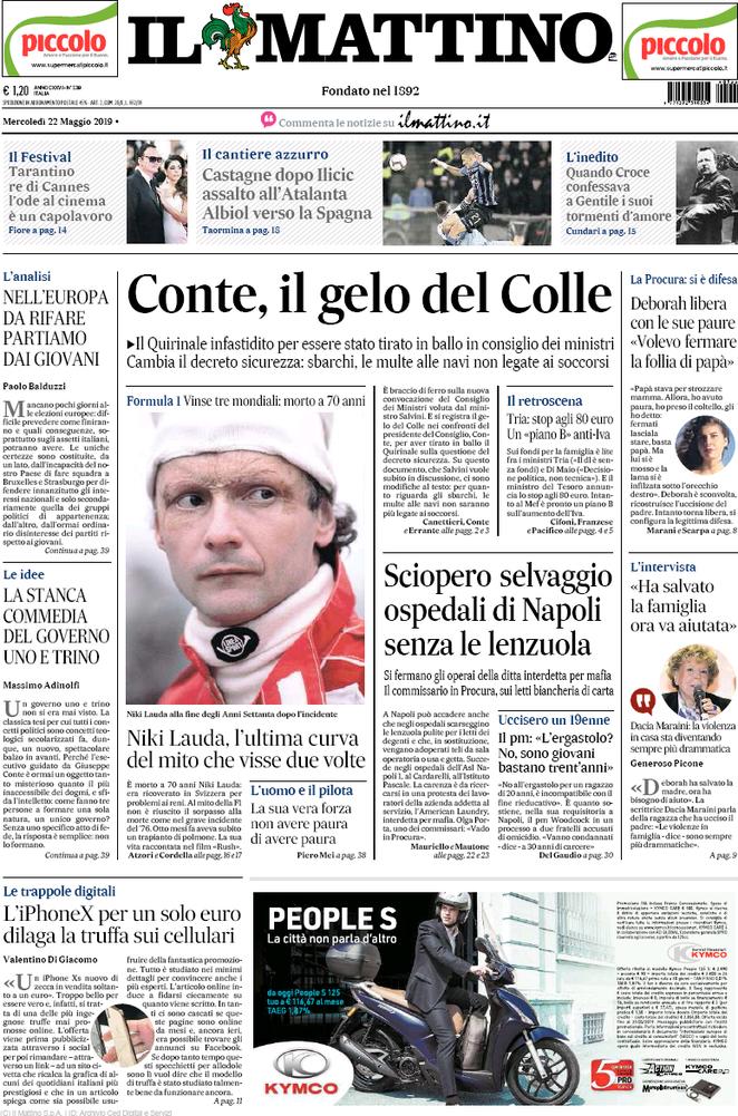 PRIME PAGINE QUOTIDIANI OGGI 22 MAGGIO – Ecco i titoli e le notizie sulle prime pagine dei quotidiani di oggi, mercoledì 22 maggio 2019. Le informazioni dai principali giornali italiani. Al centro del dibattito politico ci sono ancora le tensioni interne al governo alla vigilia delle Elezioni Europee, il no al decreto famiglia voluto dal capo politico M5S Luigi Di Maio e le tensioni sul decreto sicurezza bis, una battaglia dell’altro vicepremier, Matteo Salvini. Non poteva mancare un saluto al campione di Formula 1 Niki Lauda, tre volte campione del mondo, che ieri si è spento all’età di 70 anni.