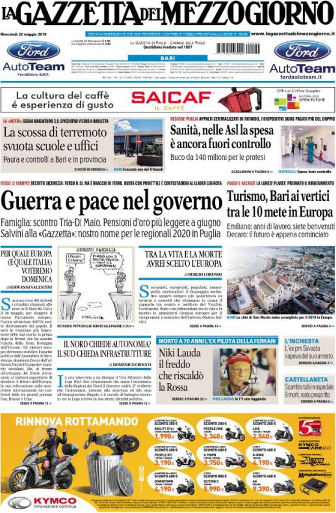 La Gazzetta del Mezzogiorno: “Guerra e pace nel governo. Famiglia: scontro Tria-Di Maio. Pensioni d’oro più leggere a giugno. Salvini alla ‘Gazzetta’: nostro nome per le regionali 2020 in Puglia”